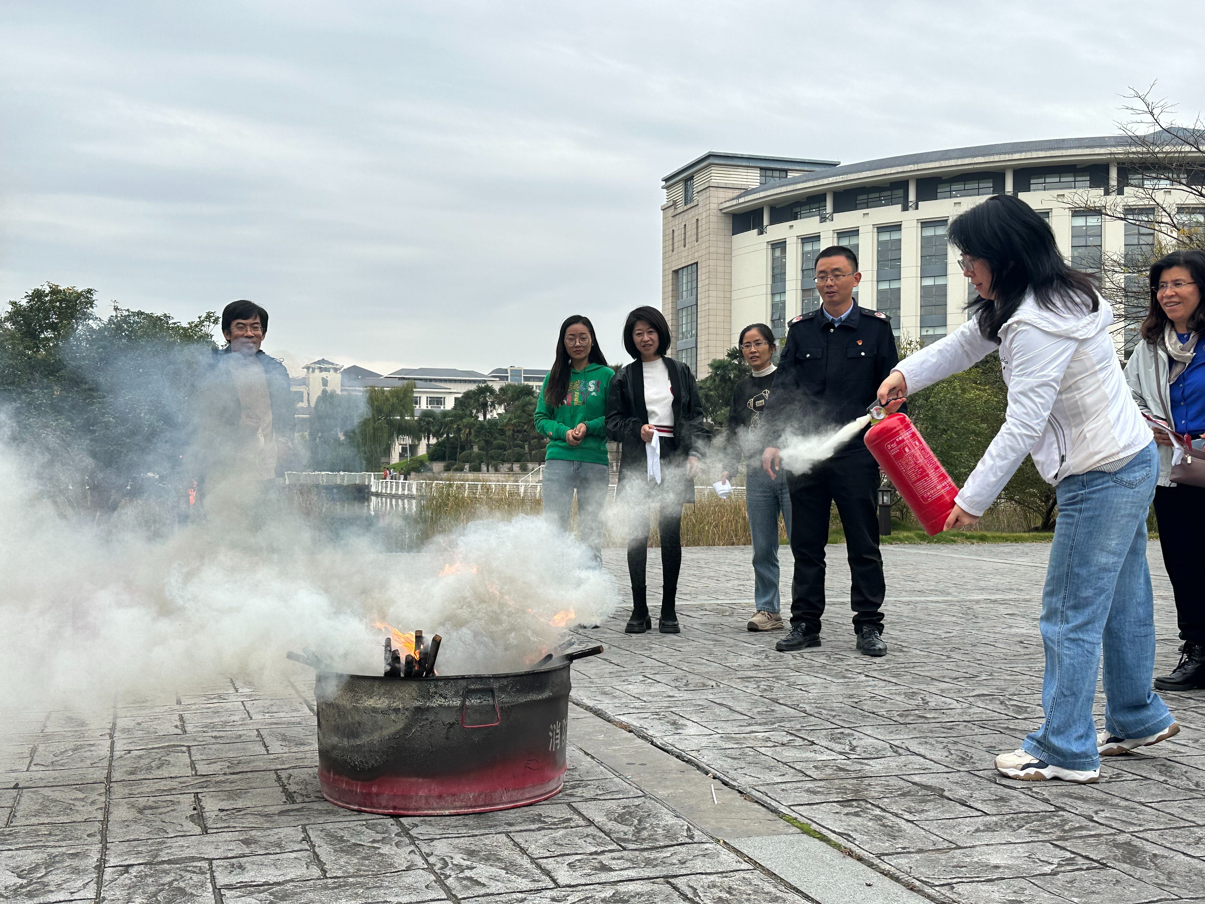 11时10分,活动进入灭火实操环节。保卫处消防专员点燃柴油火盆,现场详细示范了二氧化碳灭火器、干粉灭火器、防毒面具及灭火毯的操作要领与使用区别,重点剖析了“提、拔、握、压”和“一抖、二盖、三压、四折”等关键动作步骤。随后,智慧校园建设中心人员分批次上前,亲身体验真火扑救。共计18人次完成实操考核,合格率达到100%,有效锤炼了师生的初期火灾应对能力。